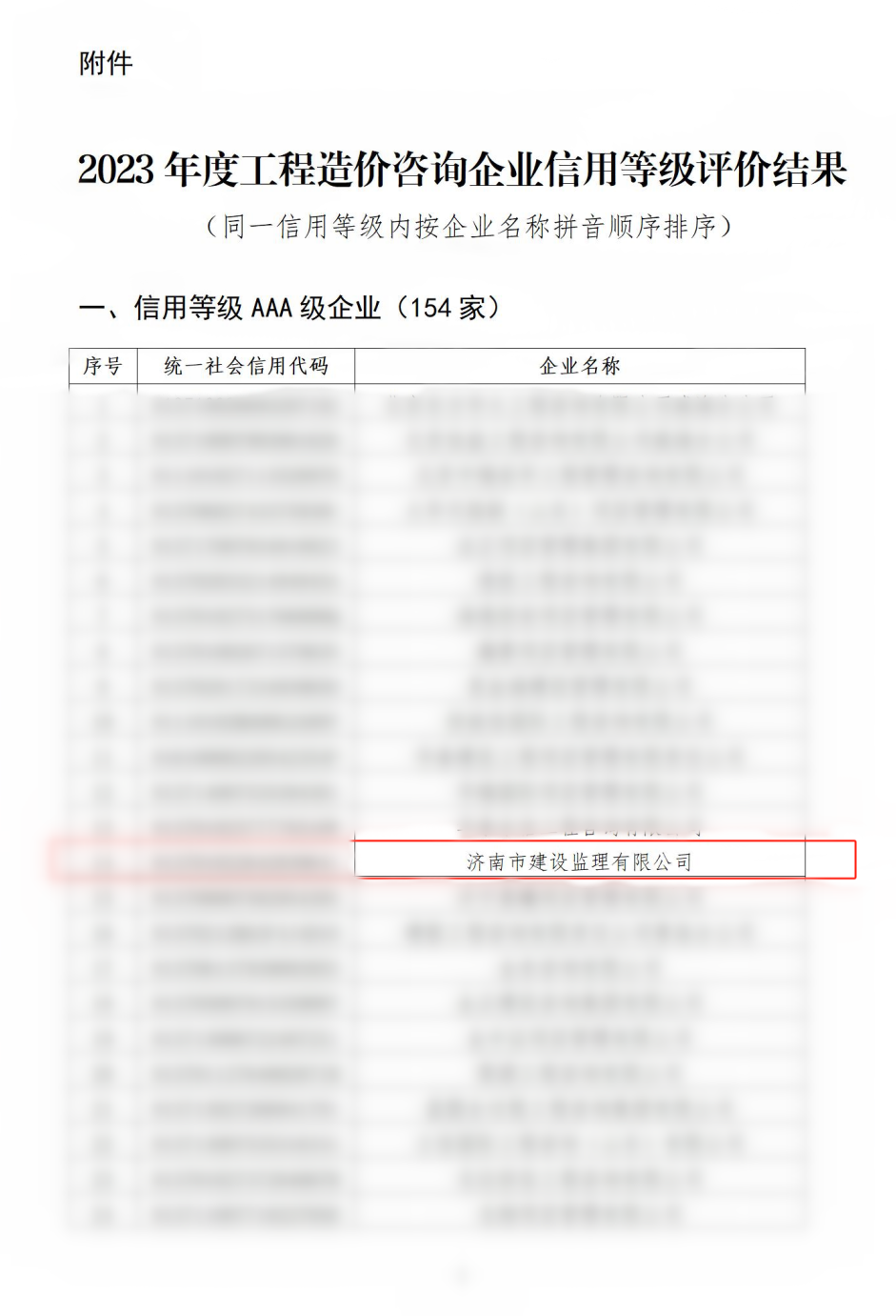 喜報!濟(jì)南監(jiān)理獲評2023年度山東省工程造價咨詢企業(yè)信用等級評價AAA等級